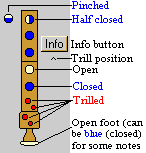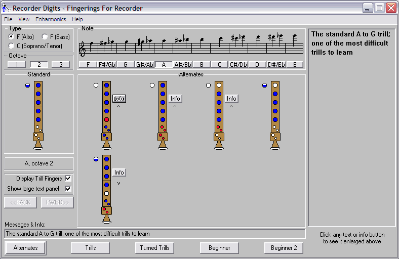By selecting 1) the Recorder type, 2) the octave, and 3) the note, you will get a display of the standard and alternate fingerings for that note. If a particular alternate fingering is usually used for a trill, the trilling fingers are shown in red. You can switch to other types of fingering information by using the Quickload Buttons.