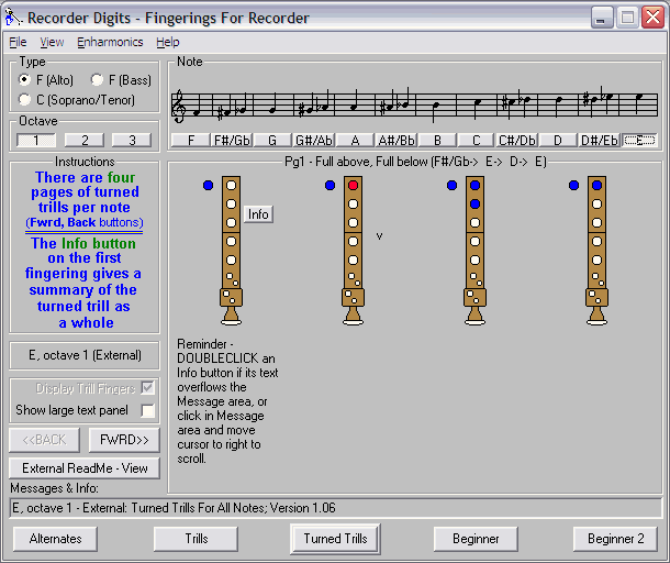 Recorder Digits comes supplied with an external file, TURNTRIL.TXT, which displays the turned trills for all notes, in the 4-fingering pattern used on this WebSite, showing all 4 possible "flavors" of a note's turned trills (full step above/full step below, etc). The file can be displayed either via the File/Load Turntril.txt menu item, or the Quickload button at the bottom of the program labeled "Turned Trills". Here is a screen snapshot of the Recorder Digits screen after the TURNTRIL.TXT file has been loaded (click on the image for a full-sized view):
