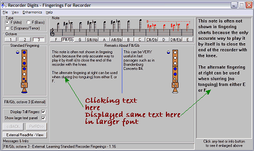 I felt that such a capability was desirable because with todays high resolution monitors, the text used in Recorder Digits can be very small and hard to read. This Large Text Panel gives the user an ability to view text in a larger font for easier reading, merely by clicking an Info button or clicking some descriptive text, while maintaining compatibility with lower-res monitors.